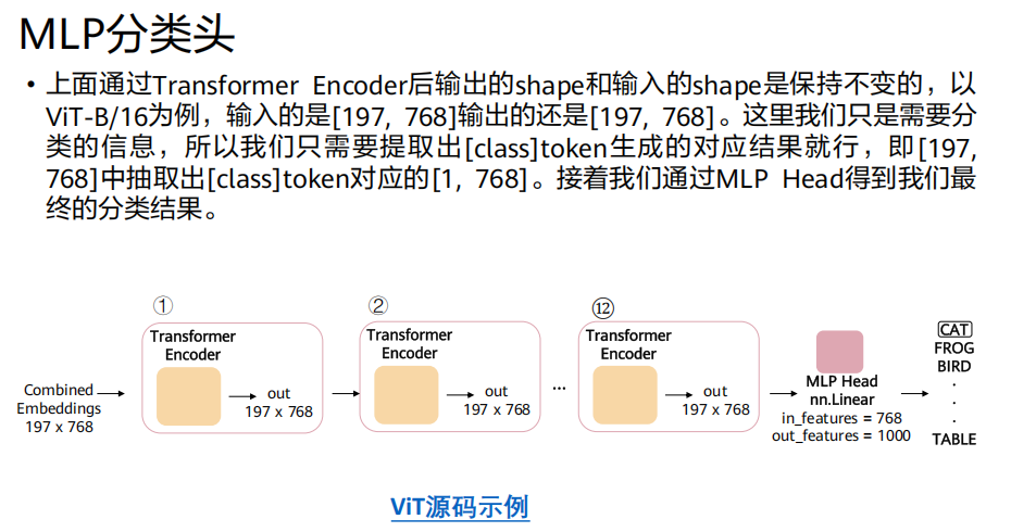 [class] token对应的输出向量 (第一行,1x768)。将这个向量送入一个小型MLP(通常是两层全连接层),得到最终的分类结果(如ImageNet的1000个类别)。