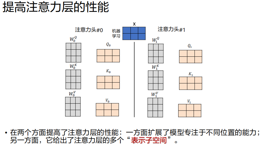Q, K, V矩阵投影到多个不同的子空间(通过不同的W_i^Q, W_i^K, W_i^V矩阵) ,然后在每个子空间里并行地执行一次完整的自注意力计算。过程: