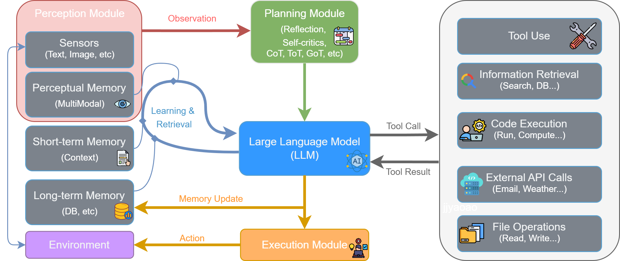 行动 (Action) :决策完成后,便进入行动阶段,由执行模块 (Execution Module) 负责。LLM生成的工具调用指令被发送到执行模块。该模块解析指令,从工具箱 (Tool Use) 中选择并调用合适的工具(如代码执行器、搜索引擎、API等)来与环境交互或执行任务。这个与环境的实际交互就是智能体的行动 (Action)。