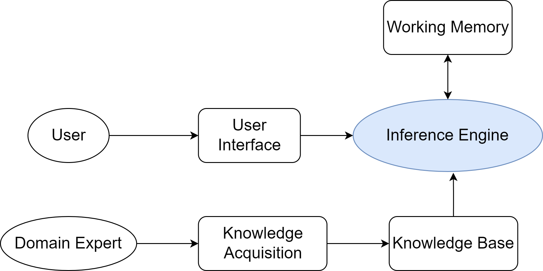 典型的专家系统通常由由知识库、推理机、用户界面等几个核心部分构成,如下图所示