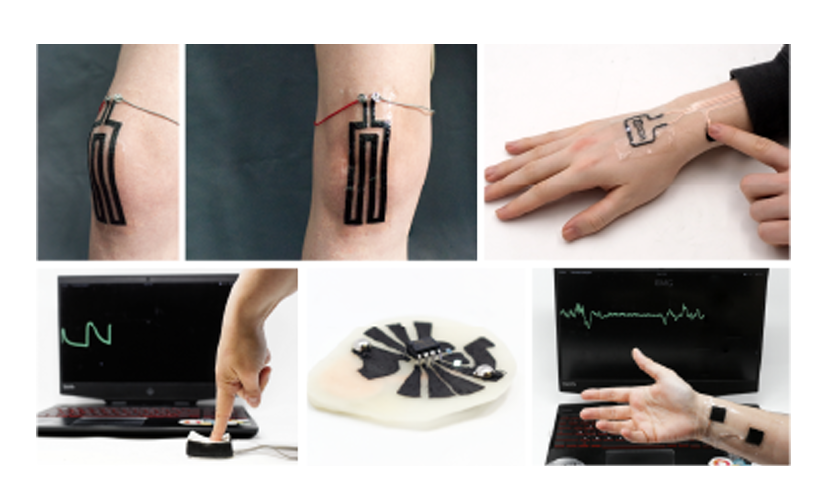 上排右侧(手背): 展示了一个集成在皮肤上的交互界面。透明部分是生物塑料基底,黑色部分是导电触点。