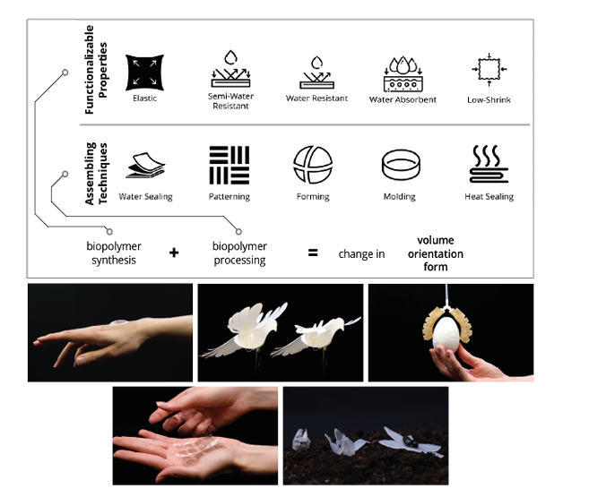中间(纸鹤/鸟状模型): 展示了形状改变。利用生物材料的收缩或膨胀特性,让模型像鸟儿扇动翅膀一样活动。