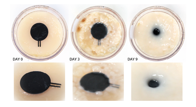 第 9 天 (Day 9): 纤维素层已经变得非常厚实且强韧。黑色的电子焊盘已经完全被生长出的生物材料包裹并固定在其中。