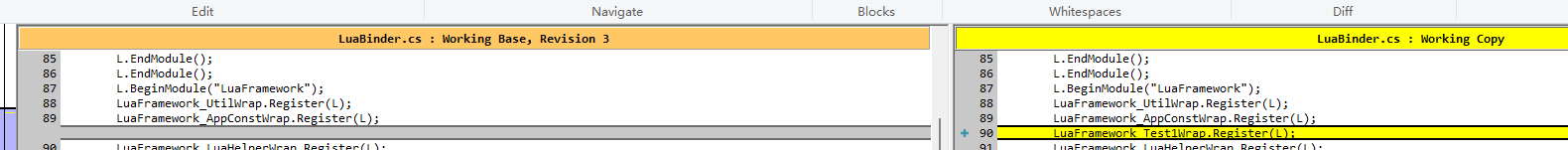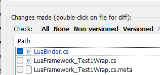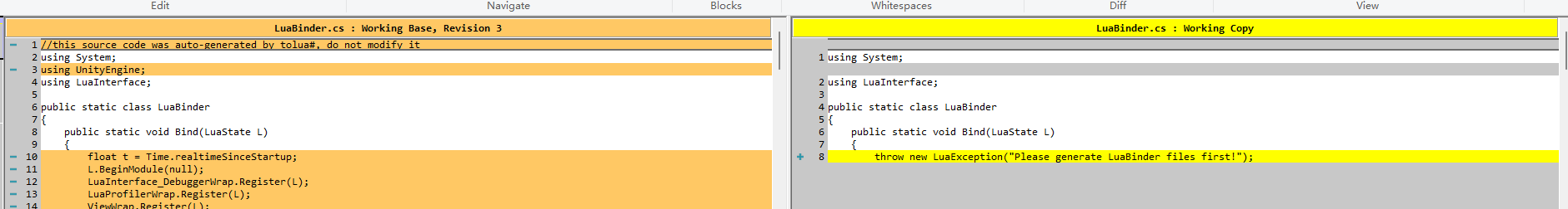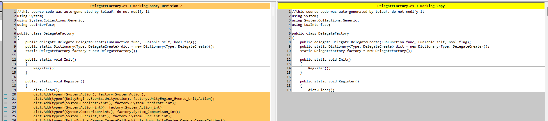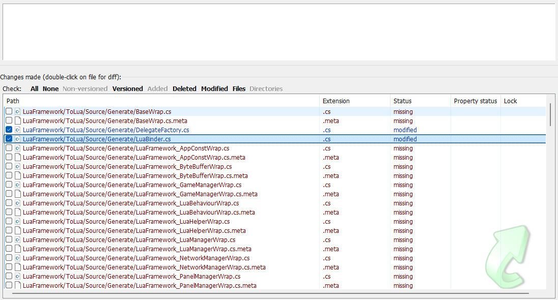 通过SVN查看文件变化,可以看到Generate目录下Wrap文件被删除了,LuaBinder和DelegateFactory文件修改了