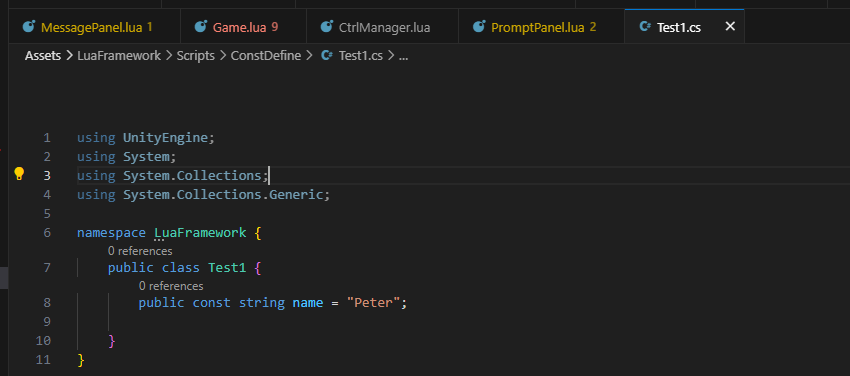 注意C#的类若放在命名空间中,Lua访问时需用【命名空间.类名】的格式访问