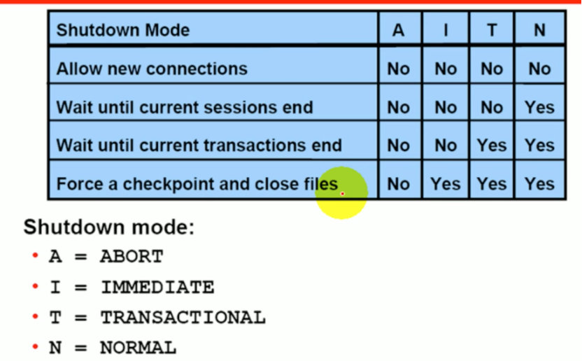 SHUTDOWN ABORT:像拔电源。立即终止所有进程,实例崩溃式关闭。下次启动需要实例恢复。仅在紧急情况下使用。