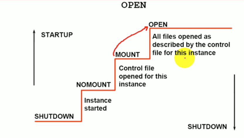 Mount: 将实例与数据库连接起来(将数据库打开给实例),也就是说这个过程她打开控制文件,其他用户不能访问数据库,只有管理员能访问,管理员可以做一些维护工作。(控制文件里包含数据文件可重做日志文件的一颗基本数据)用于重命名数据文件、开启归档模式、进行全库恢复。