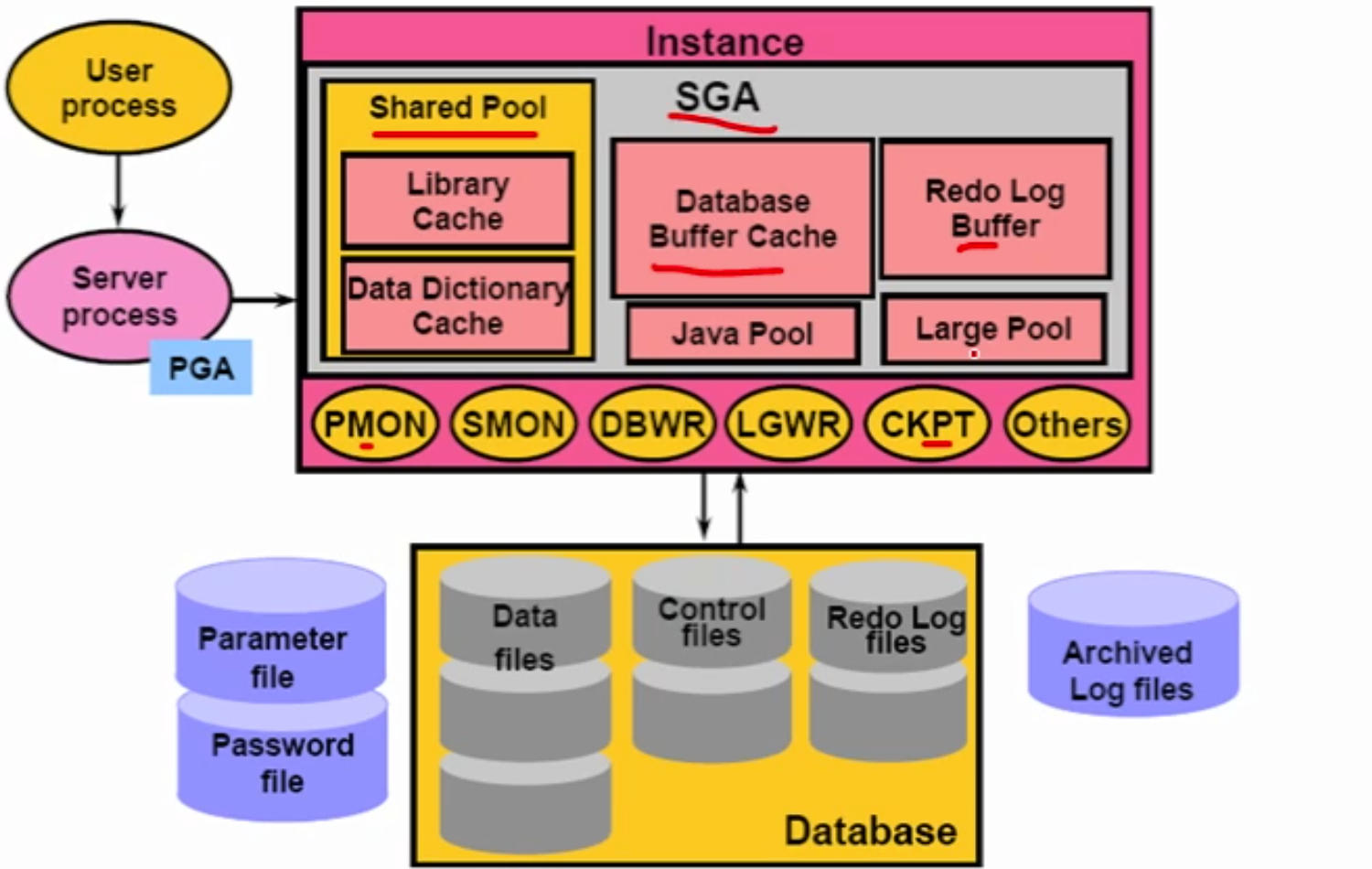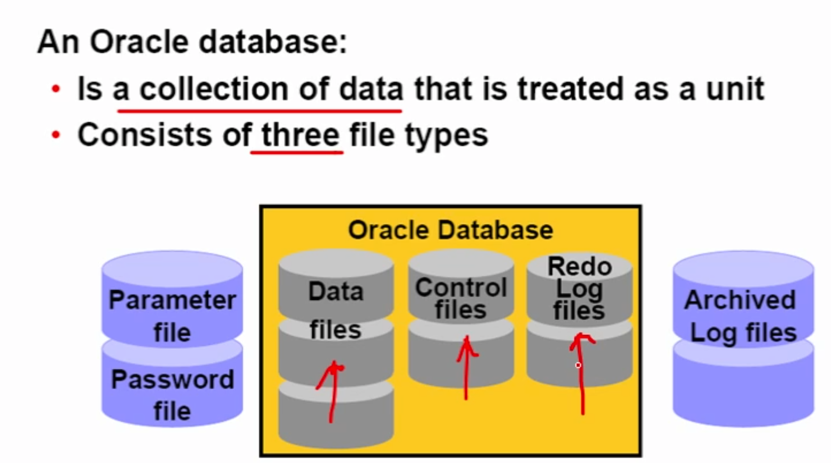 oracle 的database:主要数据文件(data file,redo log file,control file),还有参数文件parameter file ,archived log file。