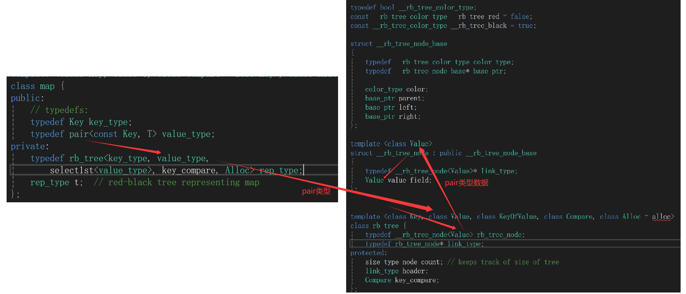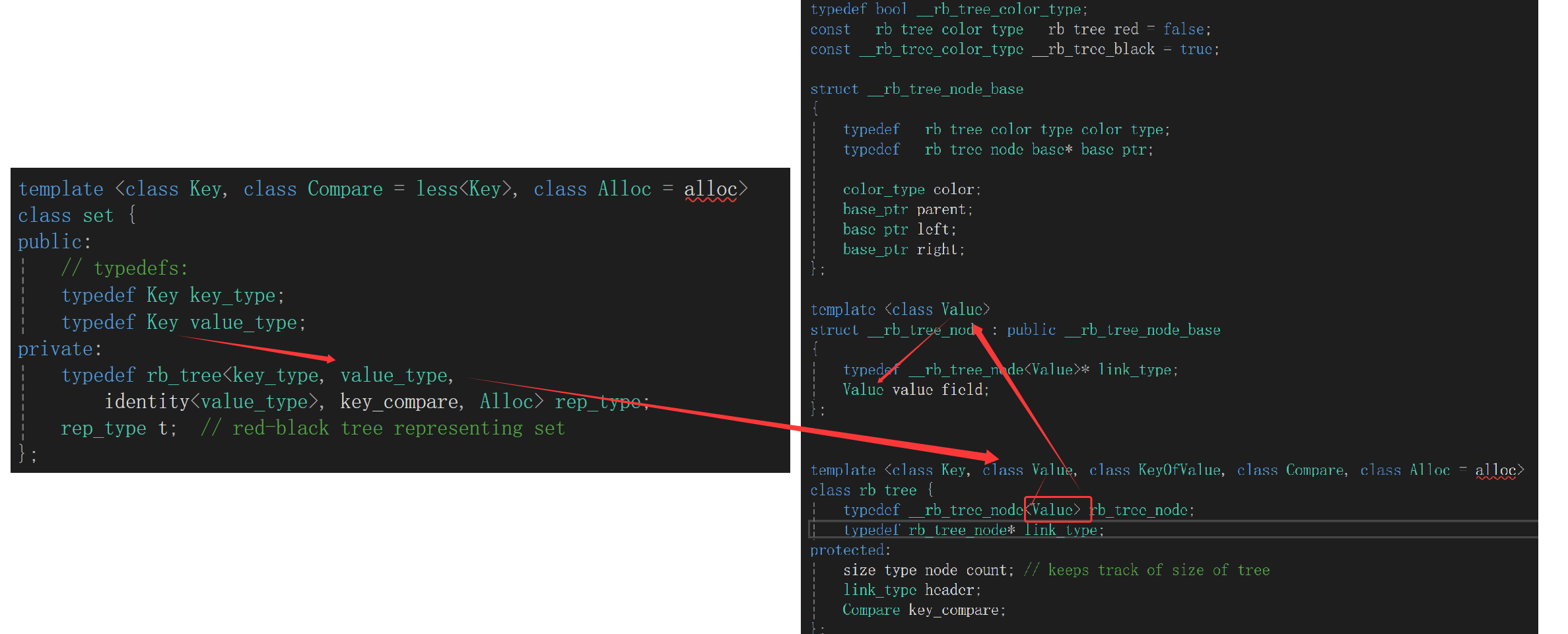 - map和set是通过红黑树封装实现的,我们首先学习一下STL库中是如何通过封装红黑树实现的map/set,截取核心部分做讲解(stl_map.h/stl_set.h/stl_tree.h)