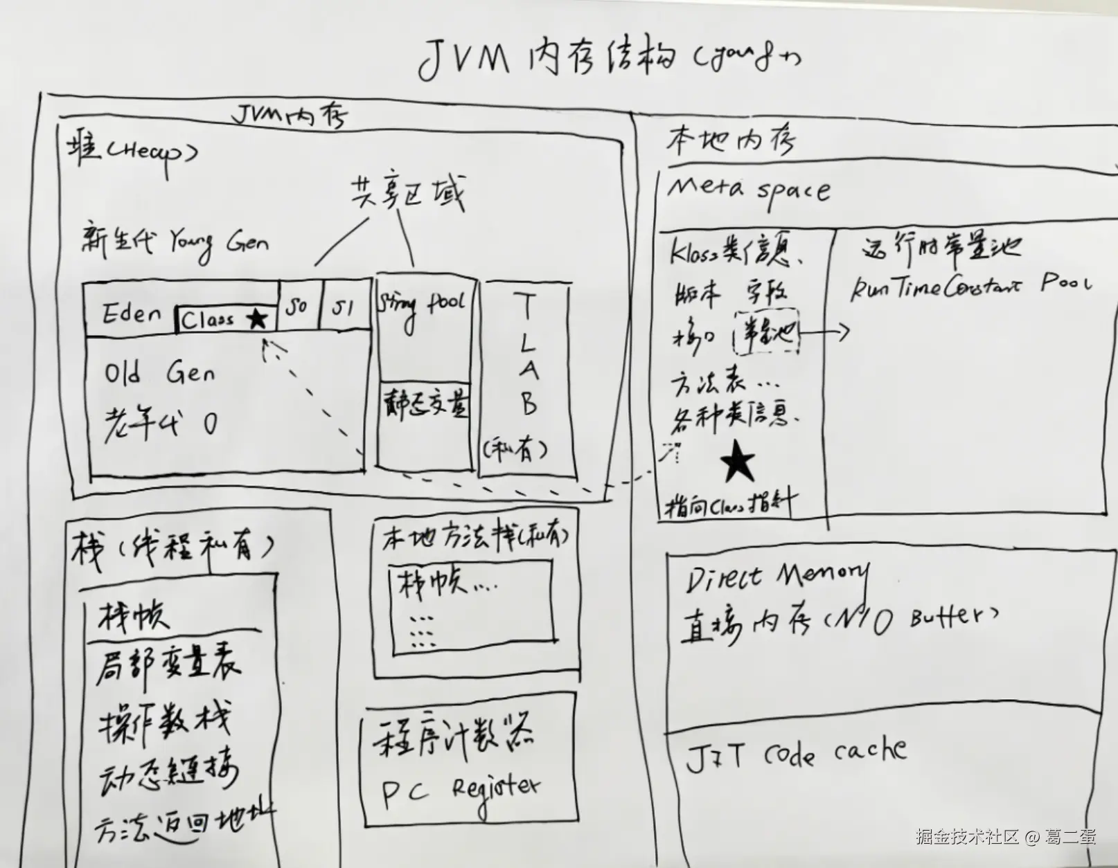 首先需要对JVM内存区域划分有个大致的概念,参考以下草绘图