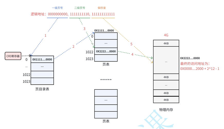 CR3 寄存器 读取⻚⽬录起始地址,再根据⼀级⻚号查⻚⽬录表,找到下⼀级⻚表在物理内存中 存放位置。