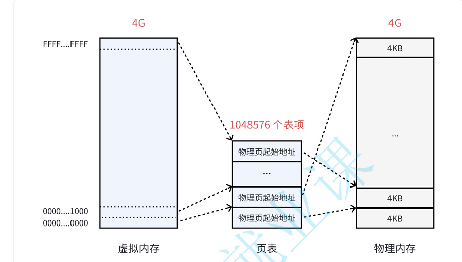 ⻚表中的每⼀个表项,指向⼀个物理⻚的开始地址。在这是每⼀个⽤⼾程序都拥有的虚拟内存空间。既然需要让 要能够表⽰这所有的 32 位系统中,虚拟内存的最⼤空间是 4GB 空间,那么就⼀共需要 4GB , 4GB 的虚拟内存全部可⽤,那么⻚表中就需 4GB/4KB = 1048576 个表项。如下图所⽰: