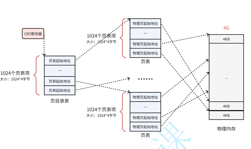 • ⻚⽬录的物理地址被 CR3 寄存器 指向,这个寄存器中,保存了当前正在执⾏任务的⻚⽬录地址。