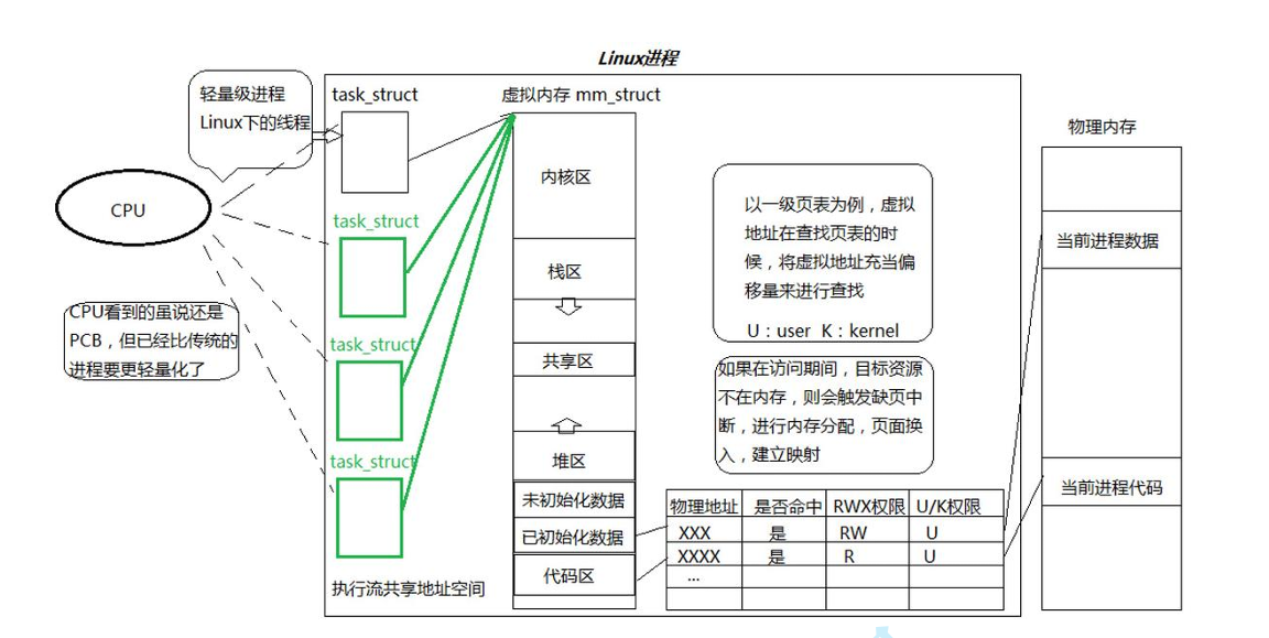 • 透过进程虚拟地址空间,可以看到进程的⼤部分资源,将进程资源合理分配给每个执⾏流,就形成了线程执⾏流