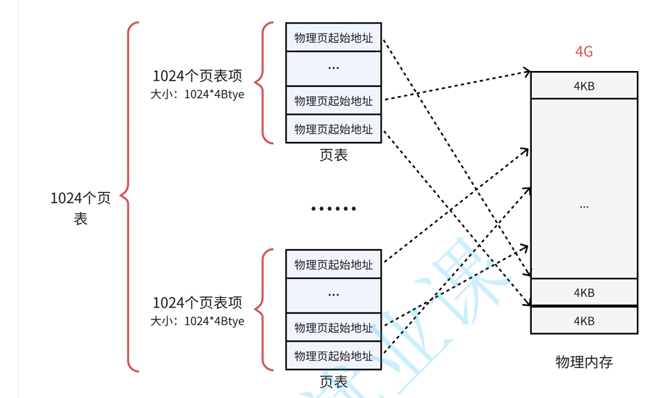 每⼀个⻚表项指向⼀个4KB的物理⻚,那么⼀个⻚表中1024个⻚表项,⼀共能覆盖4MB的物理内 存; 那么10MB的程序,向上对⻬取整之后(4MB的倍数,就是12MB),就需要3个⻚表就可以了。