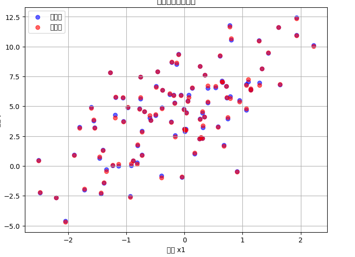 可视化效果类似这些线性回归拟合图(蓝点真实,红点/线预测,几乎重合),如图所示。