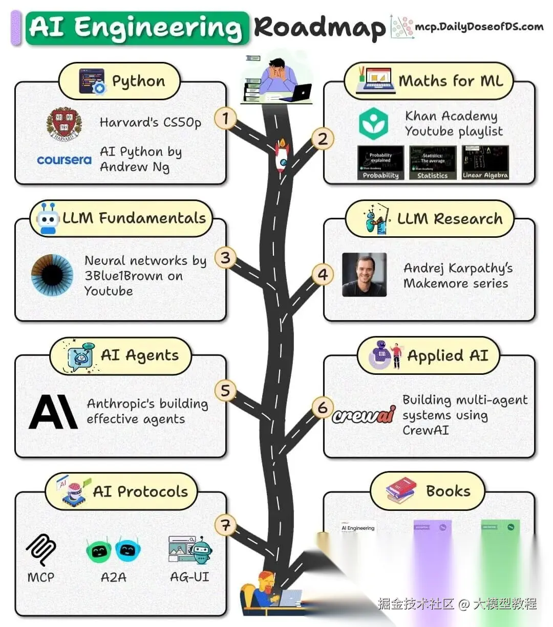 AI工程的学习逻辑是"从基础工具(Python)→ 核心技术(LLM、智能体)→ 系统协作(协议、多智能体)",跟着这个路线逐步深入,能更高效地搭建知识体系~