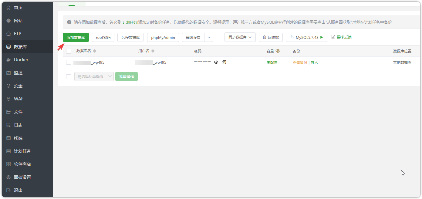 1.在宝塔面板中进入"数据库"部分,创建一个新的数据库。