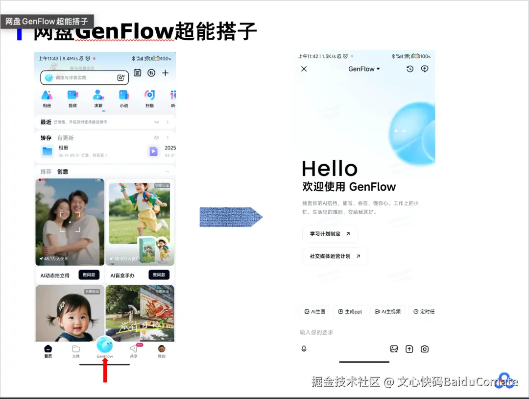 下面针对百度网盘GenFlow超能搭子项目做代码的审查演示,GenFlow超能搭子能帮你做文件智能整理、能生成视频、生成PPT。(GenFlow功能在百度网盘APP首页底部最显眼的TAB,WEB端、桌面端也有相应入口)