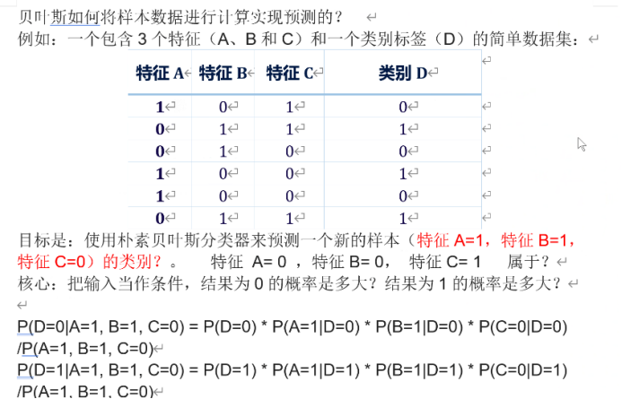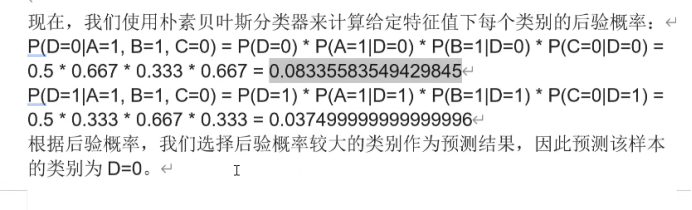 也就是我们输入一个数据,数据中中没有这种情况,此时就要求出这条数据是某个类别的概率,也就是为1的概率,和为0的概率,谁概率大就可能属于哪个类别,上图得到的两个式子分母一样,比较分子就行。
