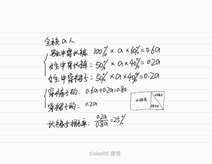 此时一个穿长裤的学生走过来,出于高度近视看不清,判断一下这个长裤学生是女生的概率?
