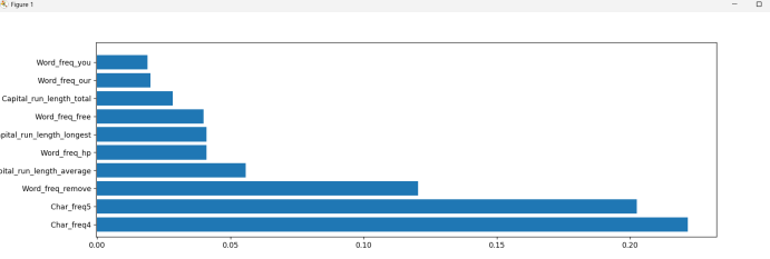 在上面代码最后加入以下代码,就可以得到重要特征的排名,这里是只取了前十的排名。并绘图站输出排名的条形统计图