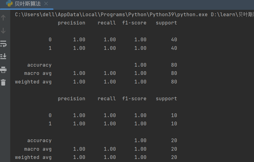 结果看似很高,但其实贝叶斯算法应用到实际问题中准确率不是很高,这里是数据的原因才会使得准确率很高。