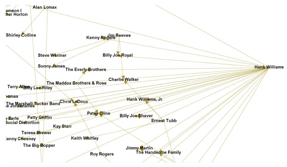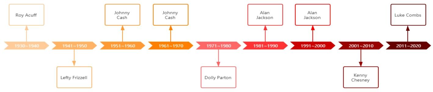 结合动态影响者和相关流派的分析结果,可以更详细地解读乡村音乐的演变:1960 年之前,乡村音乐的演变平稳,坚守蓝草音乐(Blue Grass Music)等传统乡村音乐风格,在这一平稳时期,罗伊・阿卡夫(Roy Acuff)、莱夫蒂・弗里泽尔(Lefty Frizzell)和约翰尼・卡什(Johnny Cash)等著名音乐家是乡村音乐最具影响力的人物;然而,20 世纪 60 年代摇滚乐兴起后,乡村音乐经历了与流行 / 摇滚、民谣和爵士等其他流派的深度融合;20 世纪 80 年代,由于有影响力的艺术家艾伦・杰克逊(Alan Jackson)的出现以及 "新乡村"(New Country)子流派的诞生,传统乡村音乐经历了短暂的复兴;尽管如此,传统乡村音乐最终在 21 世纪分裂为更多分支,且与其他流派的融合从未停止;近年来,最具影响力的乡村音乐家是肯尼・切斯尼(Kenny Chesney)和卢克・库姆斯(Luke Combs),他们擅长将乡村音乐与其他流派的元素相结合。