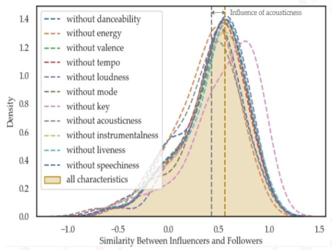 首先,利用所有 12 项音乐特征(排除与歌曲本身创作无关的描述性特征)为每位影响者和追随者构建 12 维特征向量,计算其余弦相似度密度(如棕色线条和阴影所示);随后,分别移除每项特征,构建 11 维特征向量,再次计算影响者与追随者之间的相似度。从图中可以看出,移除原声性(acousticness)和能量(energy)后,相似度下降最为显著,而移除其他特征仅导致轻微下降甚至上升。因此,得出结论:在 "流行 / 摇滚" 流派中,能量(energy)和原声性(acousticness)是相对具有传染性的特征,这表明它们更有可能给追随者留下深刻印象,并在后续被模仿。