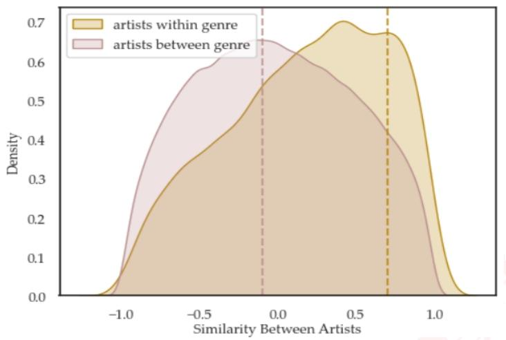 - 基于其余给定数据集,构建音乐相似度测量模型,通过对比同一流派内与不同流派间艺术家的相似度验证模型有效性;