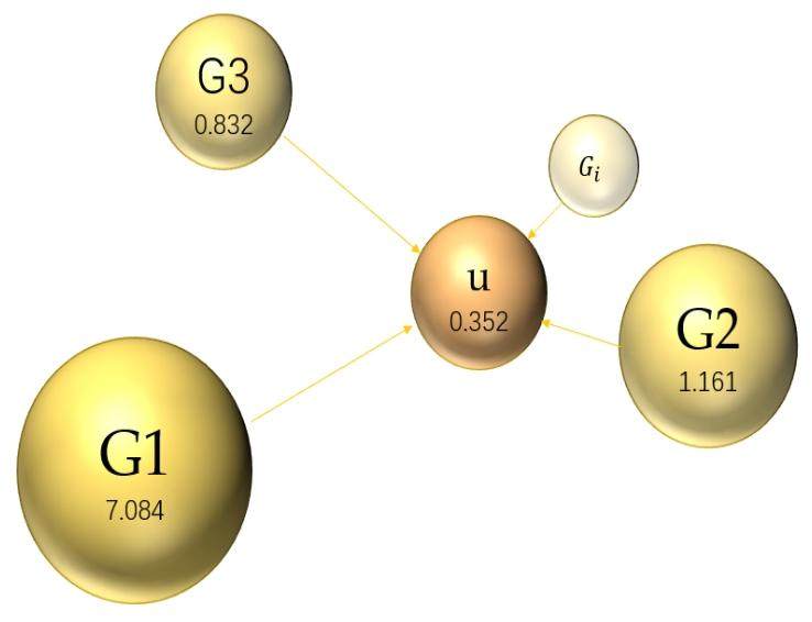 在该模型中,将流派与当年最受欢迎的流派(尚未确定)分别视为质量球体 G 和 u,流派之间不存在相互作用,仅流派 G 对 u 产生引力作用。将每个流派的平均流行度作为 G 的质量 M,流派的特征向量作为其坐标;同理,将每年所有歌曲的平均流行度作为 u 的质量 m,特征向量的平均值作为 u 的坐标。球体 G 对球体 u 的引力与 M 和 m 的质量成正比,与它们之间距离的平方成反比。例如,G₁与 u 的距离比 G₂远,但由于 G₁的质量大于 G₂,无法直接确定两者谁的引力更大。由于前文关于相似度的研究相对成熟,且相似度与距离呈明显的反比关系,因此用相似度替代距离。将相似度代入函数之前,对其进行归一化处理得到 sim_new,使其取值范围在 [0, 1] 之间:\(sim_{new} = \frac{(1 + sim)}{2}\)\(引力 = \frac{GU}{r^2} \to GU(sim_{new}^2)\)在我们的方法中,与 u 引力最大的 G 即为当年最受欢迎的流派。计算 1921 年至 2020 年每年的主导流派,结果如演变时间线全貌所示。