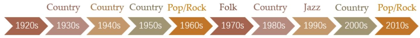 从时间线中可以看出,20 世纪 50 年代之前,主导流派主要是爵士、蓝调和民谣(Folk);20 世纪 50 年代,乡村音乐和声乐(Vocal)曾有过繁荣的机会,但最终流行 / 摇滚胜出;1955 年至 1976 年,流行 / 摇滚几乎是每年的主导流派,可见其受欢迎程度空前;然而,20 世纪 80 年代,节奏蓝调、雷鬼(Reggae)和民谣开始崭露头角;进入 21 世纪,主导流派变得更加多样化,新世纪音乐(New Age)和电子(Electronic)等新兴流派也越来越受欢迎。