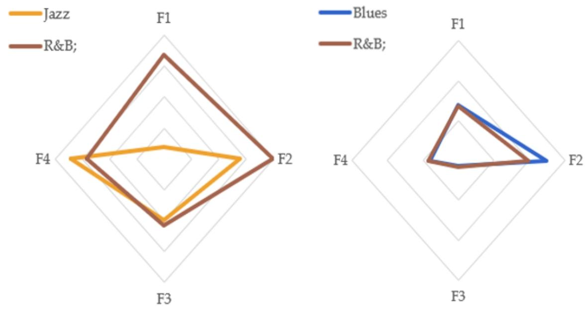 关于流派区分,我们认为几乎不可能通过单一特征将某一特定流派与其他所有流派区分开来。毕竟,总共存在近 20 个超级流派,其中一些流派几乎没有相似之处,而另一些则可能极为相近。因此,选择通过解释如何区分相似流派来回答流派区分的问题,以节奏蓝调(R&B)为例。从热力图中可以看出,节奏蓝调与蓝调(Blues)和爵士(Jazz)非常相似。事实上,节奏蓝调(又称节奏与蓝调)起源于包括爵士和蓝调在内的其他黑人音乐。为将节奏蓝调与其两个起源流派区分开来,基于前文所述的四个因子绘制雷达图。