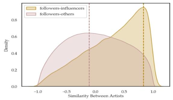 可以看出,影响者与追随者之间的相似度约为 0.8,而追随者与其他艺术家之间的相似度降至 - 0.1。因此,得出结论:数据集中识别的影响者确实对其追随者产生了影响,至少在音乐创作过程中是如此。