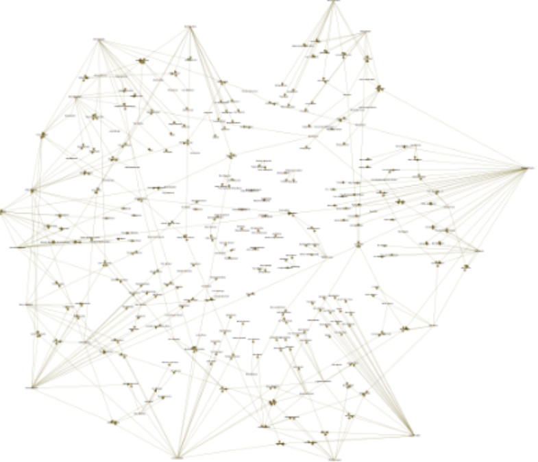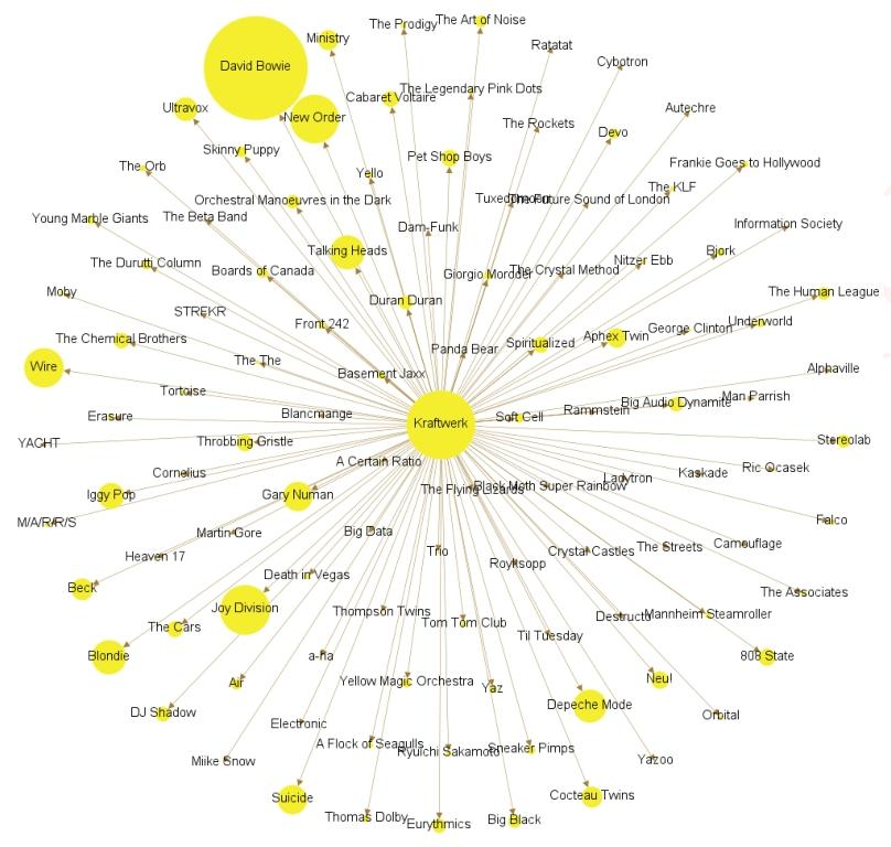 选取所有艺术家姓名构建网络时,并未绘制代表各自音乐影响力(MI)的不同大小的点,否则连接密集区域会变得模糊不清。因此,本节将展开进一步探索:以传奇电子乐队发电站乐队(Kraftwerk)为中心构建子网络,详细阐释影响网络及音乐影响力的测量方法。