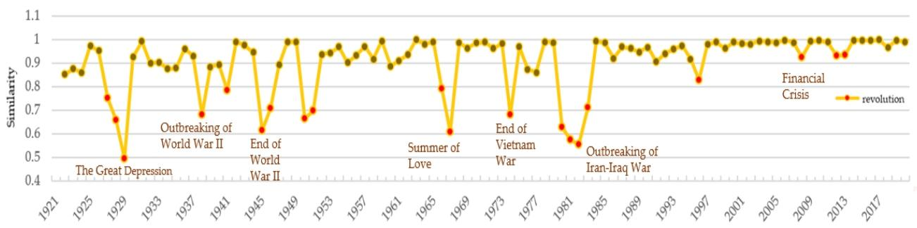 相似度越小,表明这两年之间的差异越大。从时间线中可以得出结论:大多数情况下,音乐的演变较为平稳,两年之间的相似度在 0.8 以上;然而,在 1929 年、1938 年、1945 年、1949 年、1966 年、1974 年、1980 年前后,相似度出现了一些急剧下降(标注为红色);21 世纪也出现了一些小幅度的下降。这些与前一年相似度较低的年份可被视为音乐变革时期,导致音乐特征发生重大飞跃,相似度显著降低。研究发现,近年来的变革时期较少。考虑到如今音乐流派的多样性和相对和平的世界局势,认为这一结果相当合理。