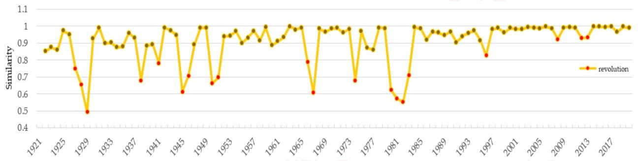 前文已充分利用基础模型探索艺术家和流派的演变过程,但音乐演变中更重要的是那些将音乐推向新高度的革命性转变。我们将 "变革" 解读为音乐演变过程中两年之间的重大飞跃。因此,利用 "data_by_year" 数据集,按照前文所述的主成分分析(PCA)方法计算每年的四个因子值;在此基础上,计算每年与次年的余弦相似度,将其作为标志变革的指标。