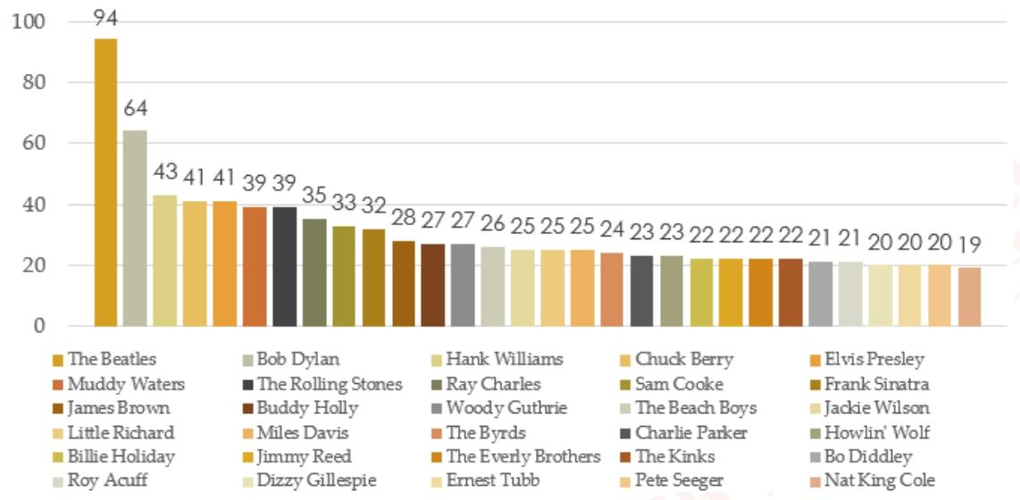 标志性革新艺术家是指其作品对同时代艺术家产生重大影响的艺术家。由于每个变革时期的革新者各不相同,仅以 1965-1967 年这一典型时期为例,其他时期的革新者可采用类似方法进行分析。为找出该时期重大变革的影响者,分析了 1965-1967 年期间发行歌曲的所有艺术家及其对应的影响者。结果显示,纵轴代表 1965-1967 年期间发行歌曲的特定影响者的追随者数量。