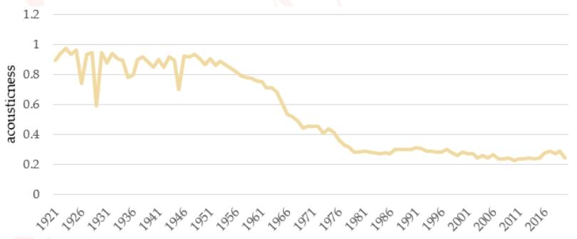 关于技术变革,从演变时间线中发现,新兴流派 "电子音乐" 在 21 世纪越来越受欢迎;与此同时,近几十年来,音乐特征 "原声性"(acousticness)稳步下降,这意味着更多的技术增强或电子放大手段被应用于音轨制作。