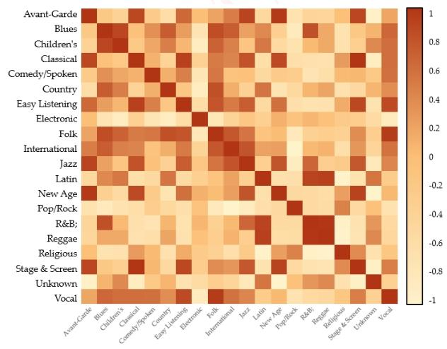 流派的特征通过该流派内艺术家创作的歌曲特征得以体现。根据 "influence_data" 中艺术家的流派信息,可以确定 "data_by_artist" 中每位艺术家的流派。基于上述第四个假设,认为每位艺术家都能体现其所属流派的特征。因此,将每个流派内所有艺术家的特征向量取平均值,作为该流派的中心值,得到 20 个流派的特征向量;计算 20 个特征向量之间的余弦相似度,得到流派相似度矩阵。为便于观察,绘制热力图,通过查看对应行和列的网格即可获取任意两个流派之间的相似度,网格颜色越深,相似度越高。该余弦相似度矩阵为对称矩阵,对角线上的网格颜色最深,表明每个流派与自身的相似度最高。后续关于流派趋势的探索将主要基于该流派相似度矩阵展开。