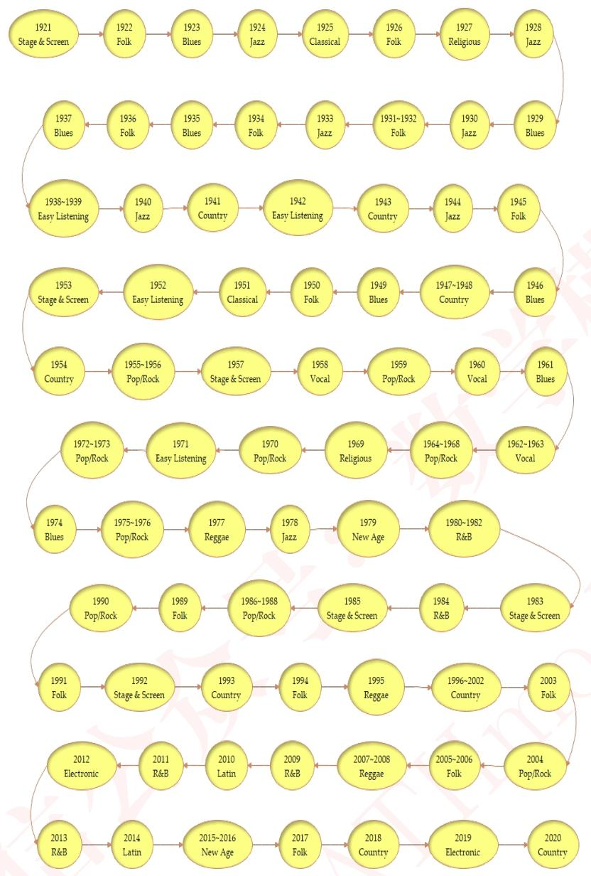20 世纪,美国的影响力几乎遍及全球,在音乐领域尤为显著。与此同时,音乐流派迅速演变,近百年间从蓝调(Blues)发展到乡村音乐(Country),涌现出大量流派(《历史侦探》)[1]。前人的研究主要集中在音频处理方面:尼古拉・奥里奥(Nicola Orio)等人基于音乐结构图构建了旋律相似度测量模型,并在小型测试集中对模型进行训练,取得了初步的音乐相似度相关成果 [2];胡安・P・贝洛(Juan P.Bello)提出了一种测量音乐唱片结构相似度的新方法,与传统方法相比,该方法假设音乐为基于区块的模型,因此重点关注分割和聚类部分,最终在特征相似度表征方面取得成果,并为所提方法提供了最优参数 [3]。