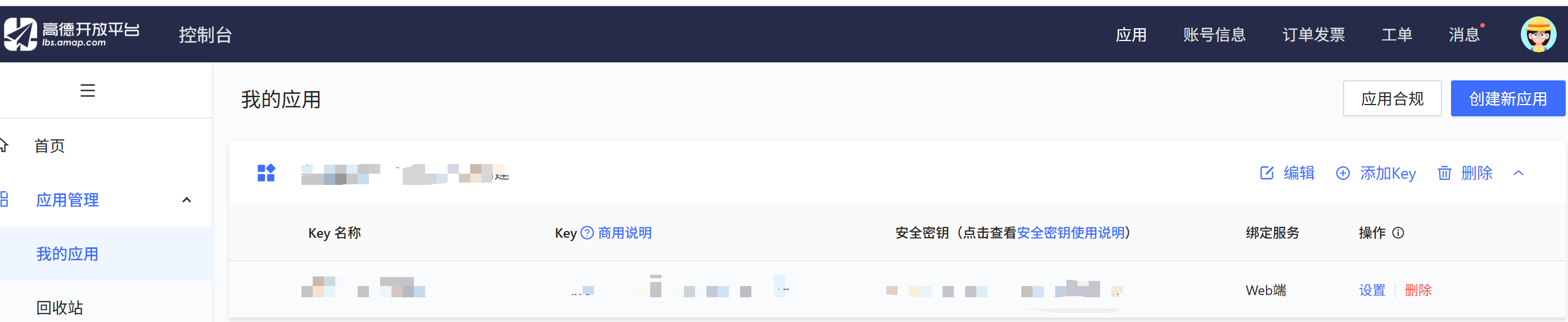 访问高德开放平台注册账号并创建应用,选择应用类型为"Web端(JS API)"。创建成功后获取Key和安全密钥。