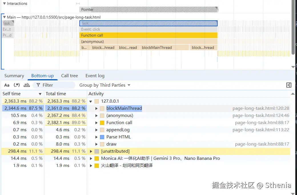 上面结果中,我们可以在 Bottom-up 面板中,时间主要是消耗在 blockMainThread,并且指向代码位置