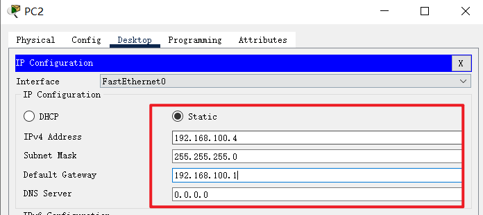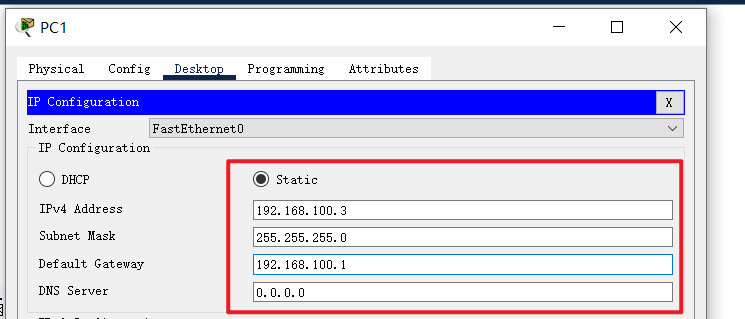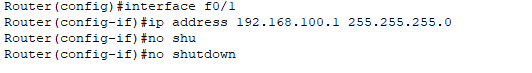 ip address 192.168.100.1 255.255.255.0 // 设置端口ip地址和子网掩码