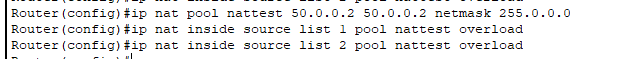 ip nat inside source list 2 pool nattest overload // 启动PAT,将表1应用到nattest