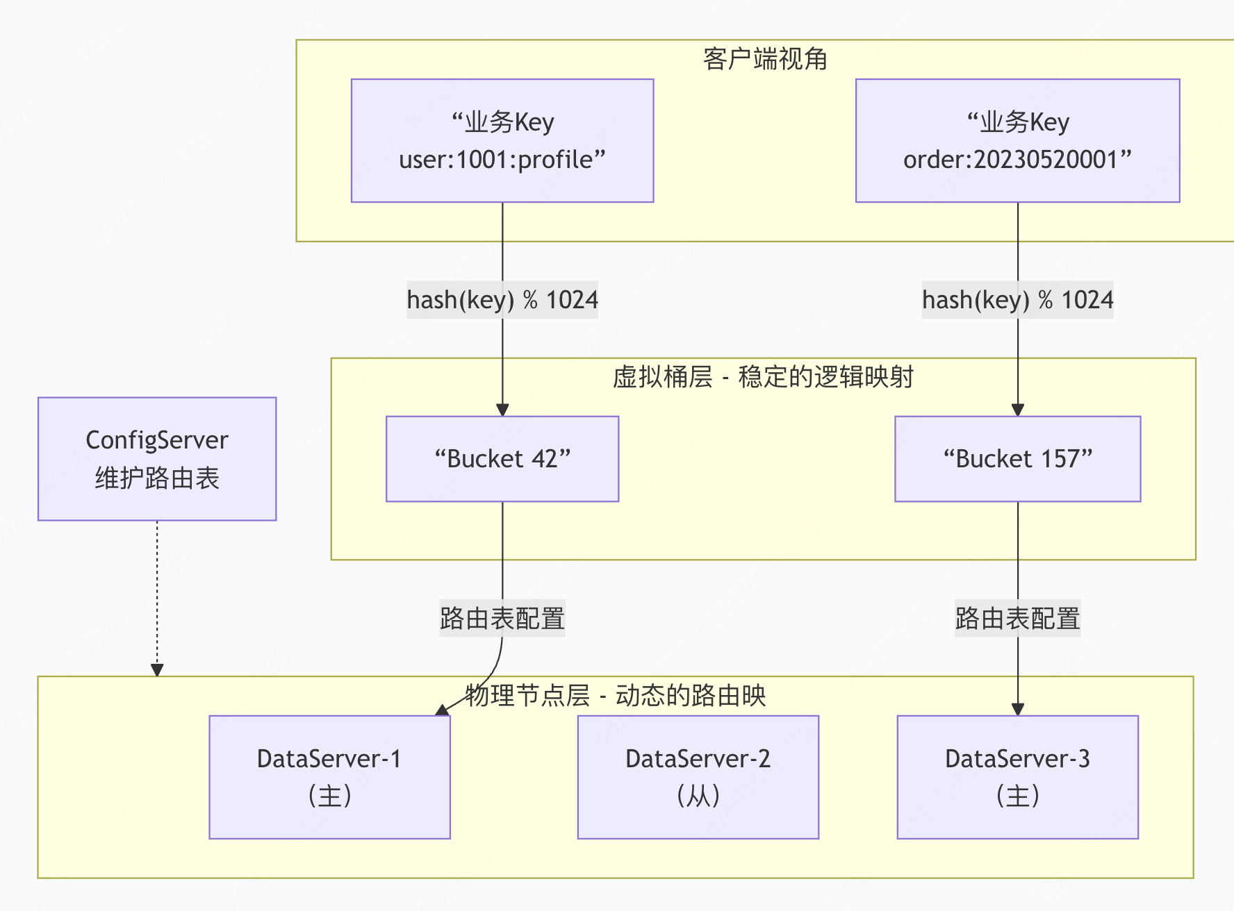 order:20230520001"] end subgraph LogicLayer[虚拟桶层 - 稳定的逻辑映射] B1["Bucket 42"] B2["Bucket 157"] K1 -->|hash(key) % 1024| B1 K2 -->|hash(key) % 1024| B2 end subgraph PhysicalLayer[物理节点层 - 动态的路由映射] N1[DataServer-1