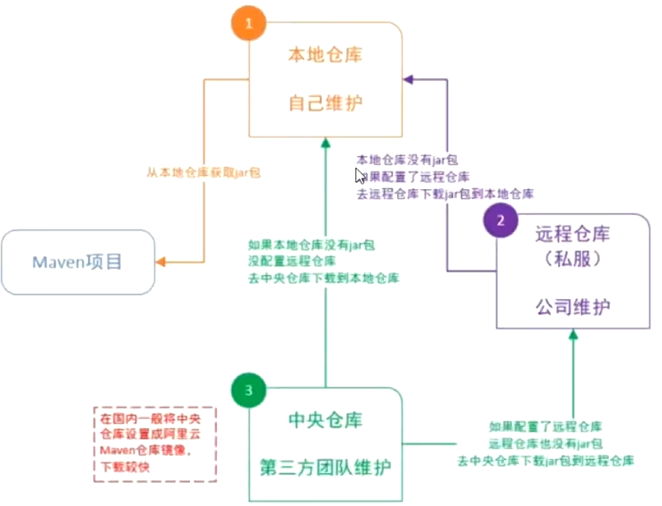 - 远程仓库:如果本地需要插件或者 jar 包,本地仓库没有,默认去远程仓库下载。远程仓库可以在互联网内也可以在局域网内。