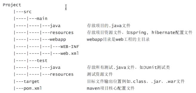 - Maven 为了让构建过程能够尽可能自动化完成,所以必须约定目录结构的作用。例如:Maven 执行编译操作,必须先去 Java 源程序目录读取 Java 源代码,然后执行编译,最后把编译结果存放在 target 目录。