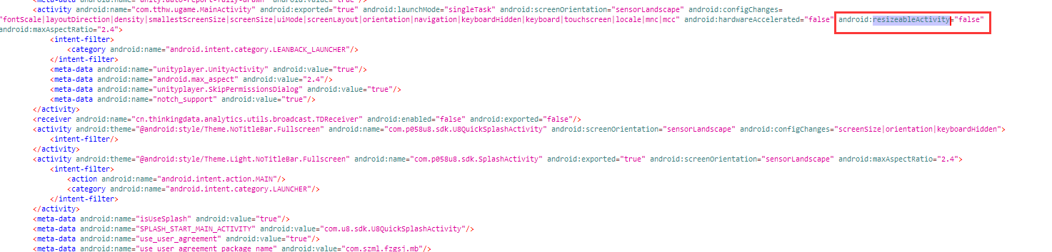 在详细对比了其他正常游戏的处理和配置,发现了区别!就是这个 "resizeableactivity " 属性的差异: