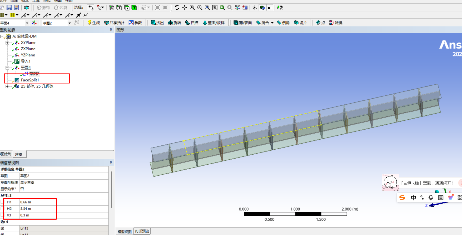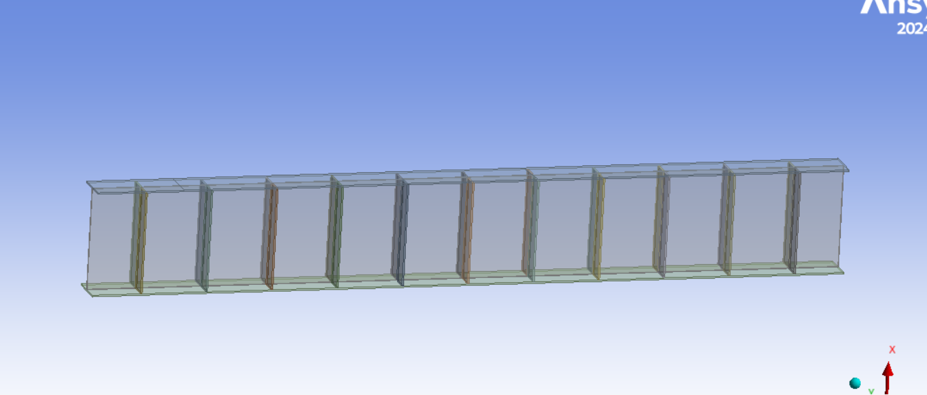 如下图所示简支梁,F1=F2=605KN,该承重横梁为H型钢非标准件,断面高度800mm,翼缘宽度300mm,腹板、翼板及加强筋板均采用12mm厚Q235B钢板制作,支撑跨度5750mm,试对其进行有限元分析。